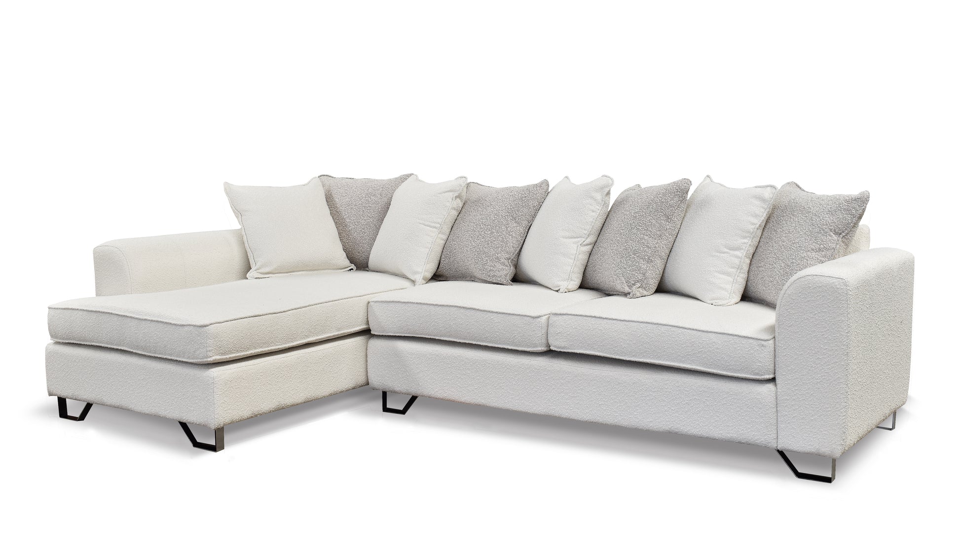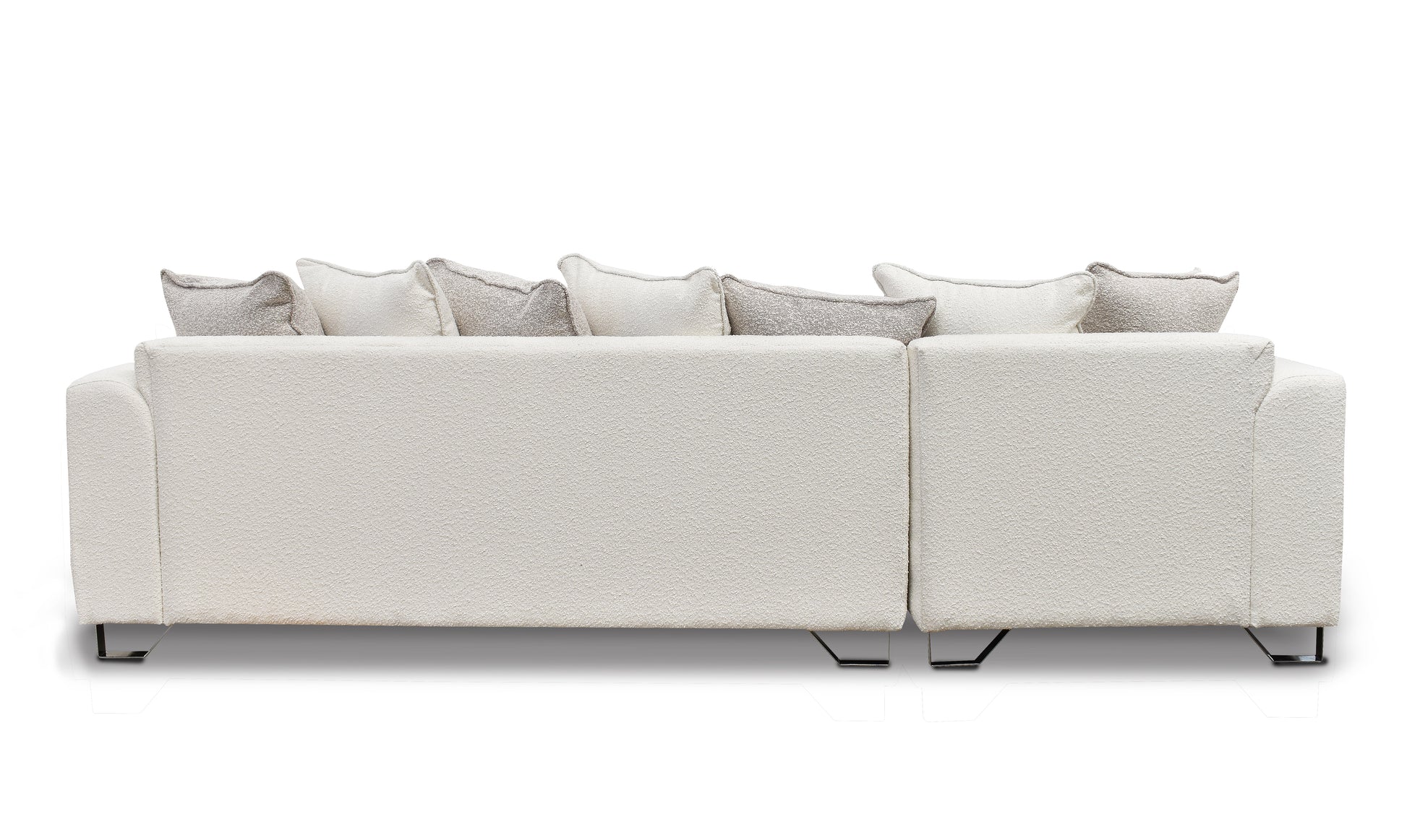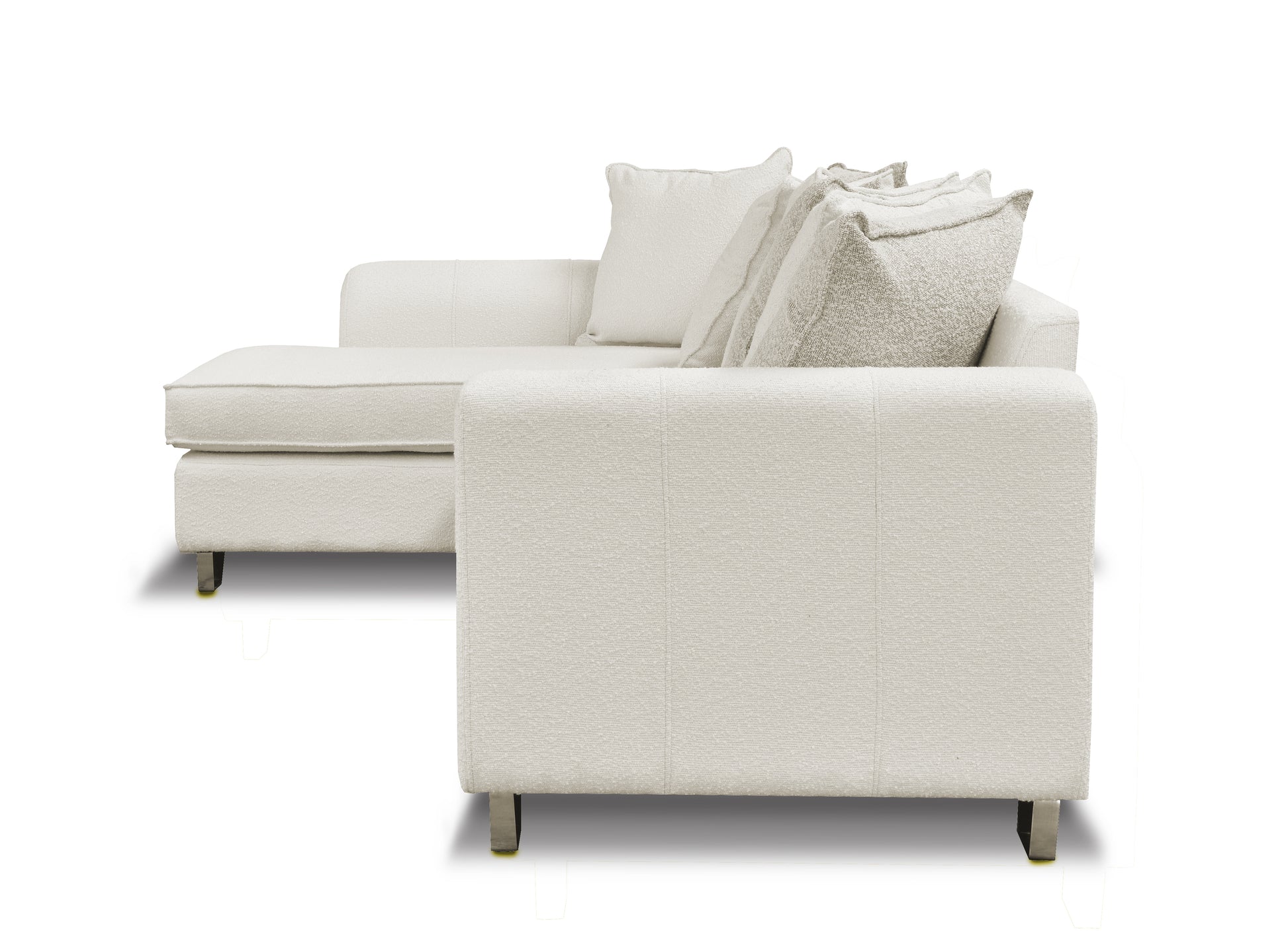 La sala modular Coppola con brazos es un sofá estilo contemporáneo con seis cojies decorativos en tela boucle con patas cónicas metalicas. Diseñado y fabricado por artesanos y productores mexicanos, con acojinamiento de alta densidad y estructura de madera de pino (con certificación forestal internacional llamada "Sello Verde").
