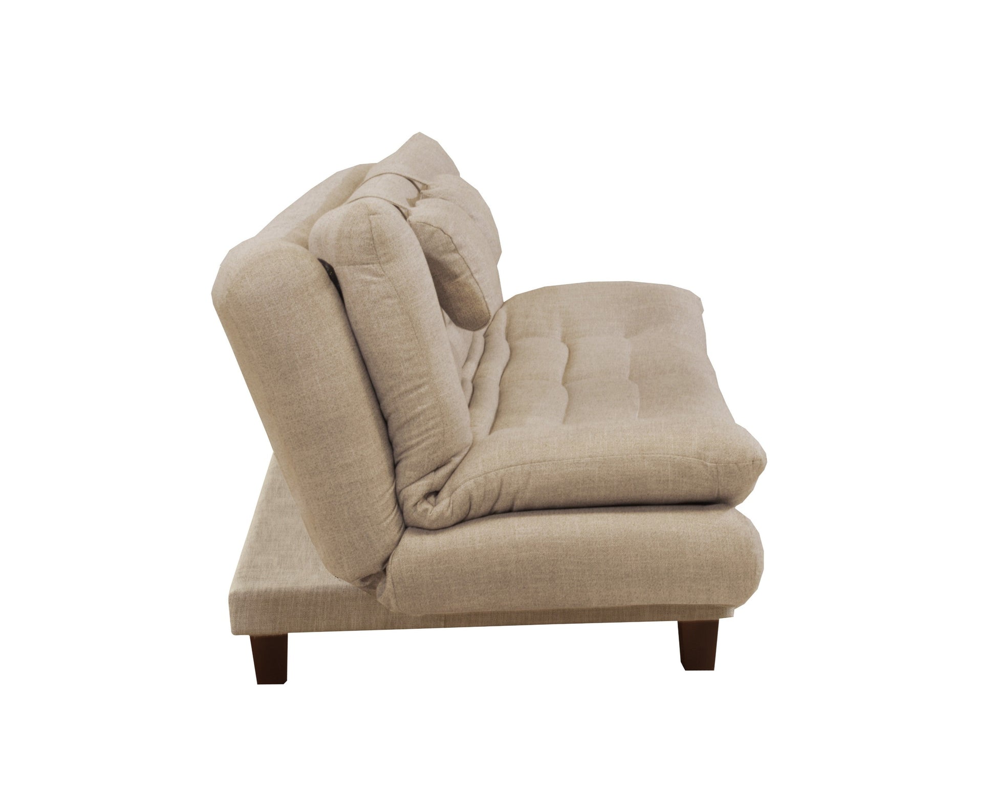 El Sofá Cama Scalone con brazos es un modelo minimalista con dos cojines decorativos en tela de lino texturizada. Cuenta con patas de madera de trapecio en acabado nogal.
