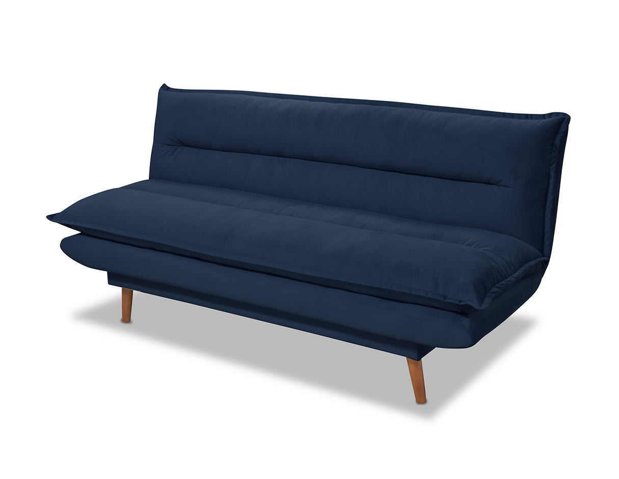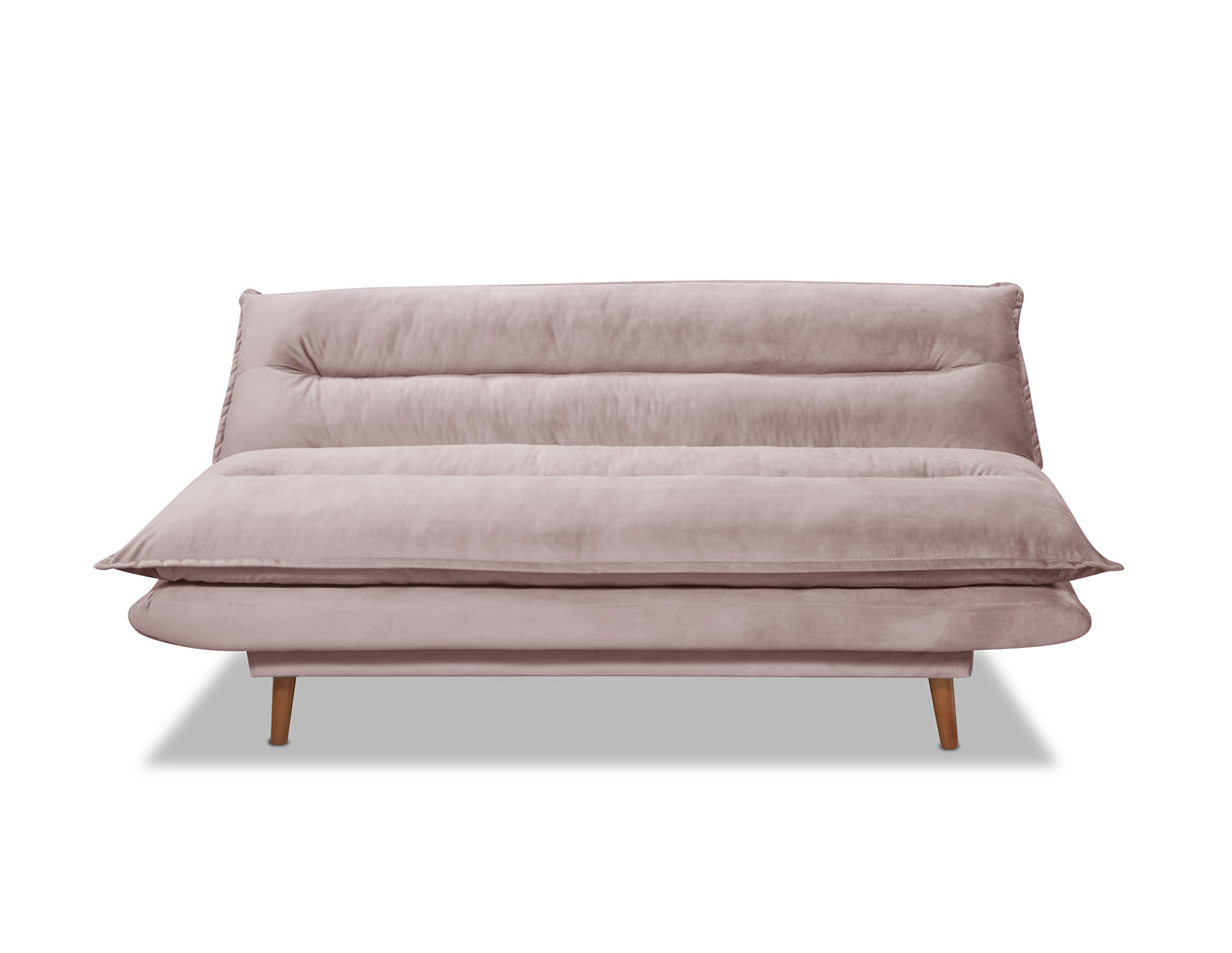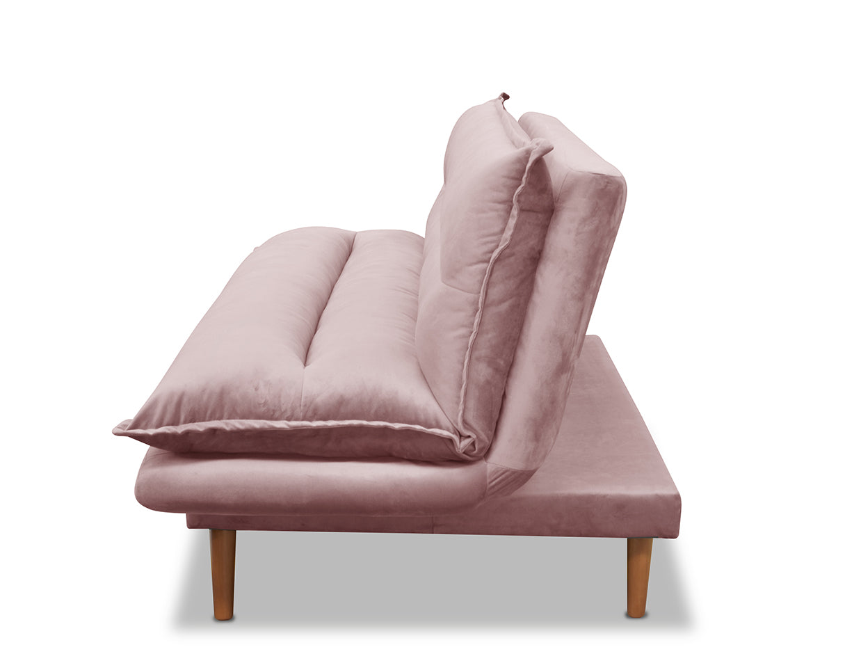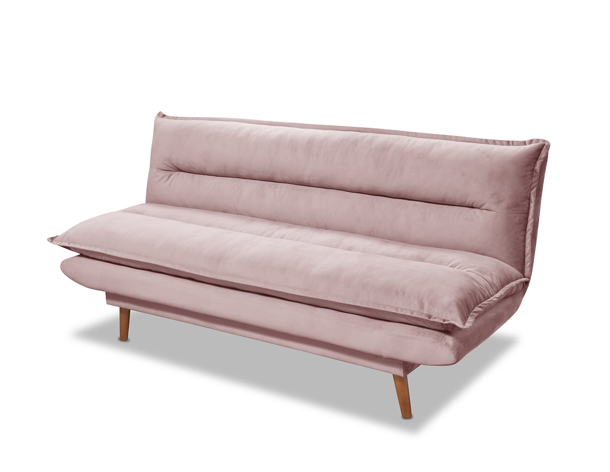 El Sofá Cama Scaletti sin brazos es un modelo estilo mid century en tela de terciopelo suave con patas de madera en forma cónica y en acabado nogal. Diseñado y fabricado por artesanos y productores mexicanos, con acojinamiento de alta densidad y fibra en colchoneta. Está hecha con una estructura de madera de pino (con certificación forestal internacional llamada "Sello Verde").