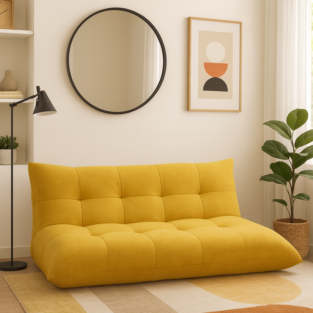 El Sofá Cama Scotti sin brazos es un modelo capitonado en tela de terciopelo suave y sin patas. Diseñado y fabricado por artesanos y productores mexicanos, con acojinamiento de alta densidad y estructura de madera de pino (con certificación forestal internacional llamada "Sello Verde").